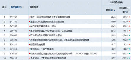 如图8所示,“电机、电气及其零件”与“核反应堆、锅炉、机器、机械器具”两大行业成为进口增长的核心,两者合计进口额达3643.1亿美元,占前十行业总额的55%以上。深度数据显示,这种增长主要由终端消费电子产品驱动,“接收、转换且发送声音等数据的设备”与“便携自动数据处理设备”增速分别高达90.32%和155.39%。这两大单品合计贡献了约893.6亿美元的进口额,是拉动“一带一路”沿线国家整体维持正增长的关键力量。(如图10)