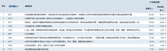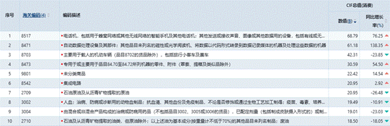 图13 2025年1-12月份美国进口前十的具体产品情况(B:十亿美元)