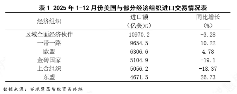 根据2025年1-12月份美国与部分经济组织进口的数据统计(见表1),东盟进口额4671.5亿美元,同比增长26.73%,增速远高于其他所有组织,表明东南亚作为新的制造中心,对美出口替代效应最为强劲。“一带一路”进口额9654.5亿美元,增长10.22%,绝对规模接近万亿美元,增速处于中等水平,显示出除中国外的新兴市场仍保持扩张态势。欧盟增速温和,传统跨大西洋贸易关系相对稳定但缺乏爆发力。